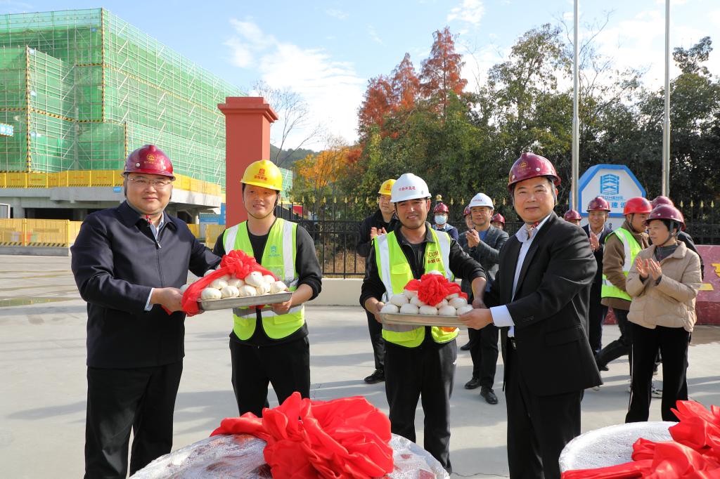 活动现场,后勤中心还特地准备了红烧肉、馒头等感谢施工单位的辛勤付出、慰问现场建筑工人。