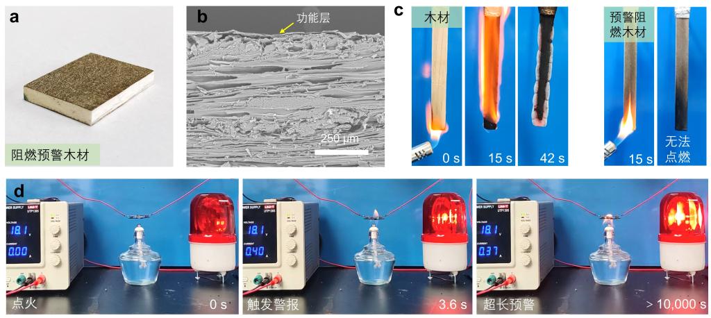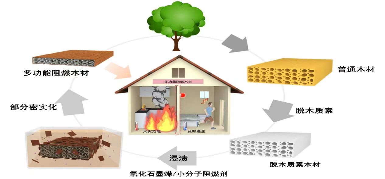 该团队利用木材天然的多尺度孔隙结构,制备出一种拥有高效阻燃性能、优异力学性能和智能火灾响应性能的多功能木质基材料。该技术显著提高了木材的利用价值,拓展了木材的应用领域,同时实现了木材“小材大用”和“劣材优用”的目标,有利于减少环境污染,完美诠释了绿色的生产生活和可持续发展的生态理念。