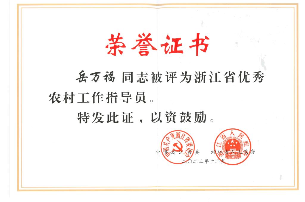 近日,中共浙江省委、浙江省人民政府联合印发《关于表彰浙江省农村工作指导员先进单位和优秀农村工作指导员的通报》。beat365官网动科动医学院岳万福教授获评“浙江省优秀农村工作指导员”,这也是岳万福第四次荣获省级奖励。