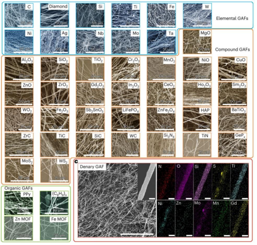虽然将粉末无损加工成具有丰富结构和功能可能性的宏观材料,具有不可估量的科学意义和应用价值,但传统加工技术无法便捷实现。基于此,研究团队开发了一种通用的纤维化方法,以二维纤维素为媒介,将各种粉末材料加工成微/纳米纤维,在为颗粒提供结构支撑的同时,保留粉末自身的特性和结构。研究发现,自收缩力驱动承载颗粒的纤维素皱缩并卷成纤维,这一温和的过程可防止粉末颗粒聚集和结构损坏,该研究技术能够为宏观材料创建一个纤维状构件库,为医疗、环境、防护、催化、能源相关、航空航天、光电材料、食品工程和日用品制造等领域的基础研究和技术应用提供丰富的材料平台和无限的可能性。