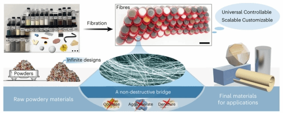 粉末作为离散单元的集合体,具有无限的纳米结构和应用可能性,在工业和实验室的第一手材料中占据主导地位。要使粉末可使用,必须将其加工成一定的宏观几何形状,如块状、线状或膜状,以获得结构机械性能。目前,烧结、成型、压制、挤压和涂覆等工艺是将粉末塑造成各种宏观材料的成熟技术,由于加工过程中颗粒的团聚和变性以及精致结构的损伤,无论粉末设计得多么完美,粉末颗粒的原始纳米结构一般都会在最终材料中消失。随着现代科技进入纳米时代,当传统材料缩小到纳米尺度时,会产生许多令人惊叹的效果,但是目前的加工技术很少能将这些精心设计的纳米效应很好地保留到最终材料中。