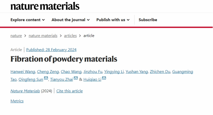2月28日,化材学院生物质仿生智能研究团队在国际顶级期刊《自然材料》(《Nature Materials》,IF=41.200)发表了题为《粉末材料纤维化》(《Fibration of Powdery Materials》)的研究论文。该项研究开发了粉末材料无损成型技术,为初级粒子和宏观应用之间架起一座通用、强大和非破坏性的微纳纤维桥梁。
