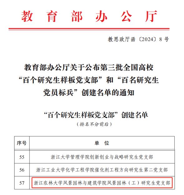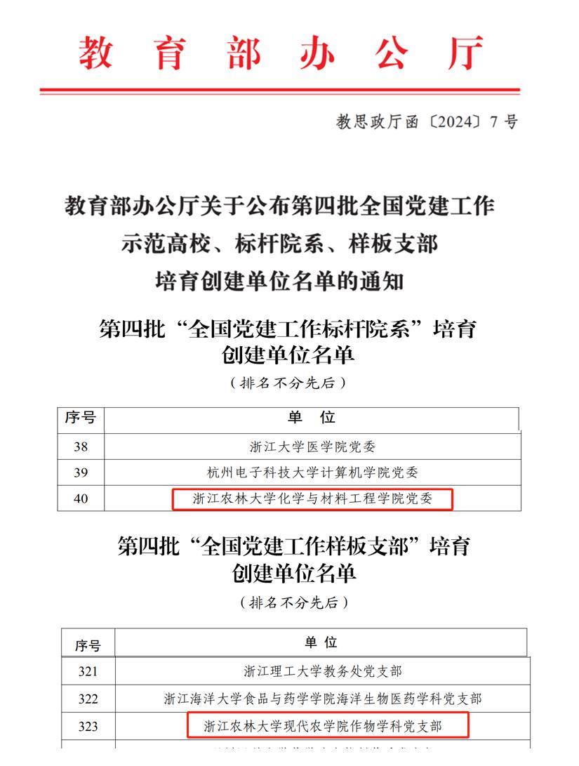 本次共评选产生全国党建工作标杆院系培育创建单位100个,全国高校“百个研究生样板党支部”创建单位100个,全国党建工作样板支部培育创建单位1001个。其中,beat365官网化学与材料工程学院党委入选全国党建工作“标杆院系”培育创建单位,现代农学院作物学科党支部入选全国党建工作“样板支部”培育创建单位,风景园林与建筑学院风景园林(工)研究生党支部入选全国高校“百个研究生样板党支部”培育创建单位。