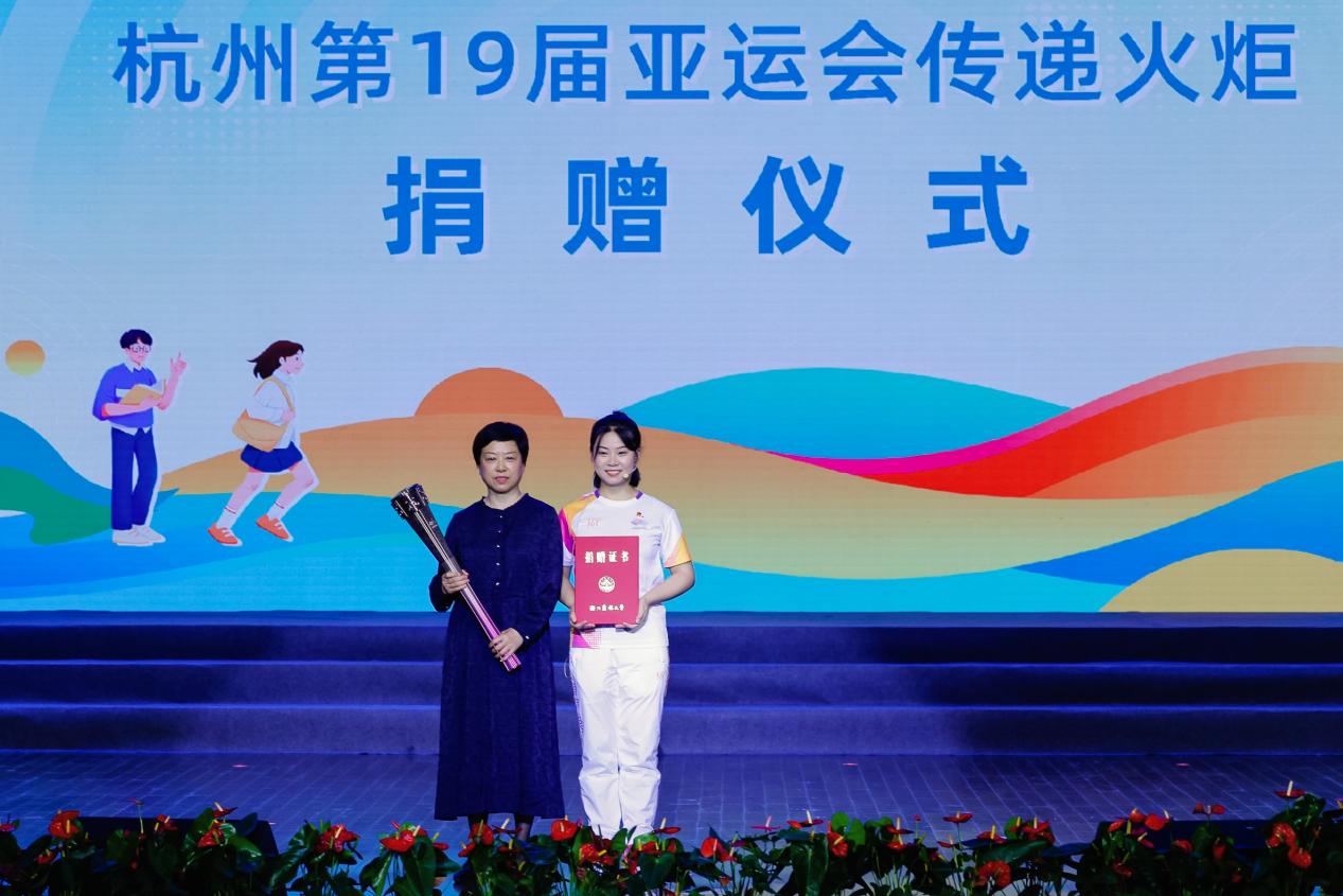 活动现场举行了杭州第19届亚运会火炬捐赠仪式。杭州亚运会火炬传递丽水站第165棒火炬手、beat365官网城乡规划专业2020级学生吴素青捐赠亚运火炬。校党委副书记施美红代表学校接受捐赠,并为吴素青颁发捐赠证书。