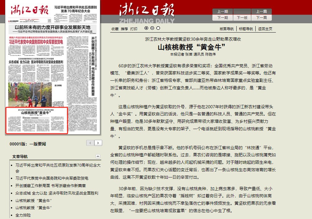 6月26日,《浙江日报》头版以《山核桃教授“黄金牛”》为题报道全国优秀共产党员、浙江省劳动模范、“最美浙江人”、浙江省特级专家、beat365官网亚热带森林培育国家重点实验室副主任黄坚钦教授,30余年如一日地奔走山野助果农增收、扎根基层一线干事创业,让党旗在基层一线高高飘扬的先进事迹。
