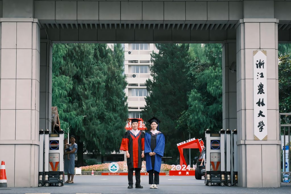 六月,繁花盛放,骄阳似火。身着学位服的两人一同拍下了属于他们的毕业照。离开学校的两人也选择留在杭州工作,继续“以强农兴农为己任”,保持初心,为“三农”工作尽一份力。