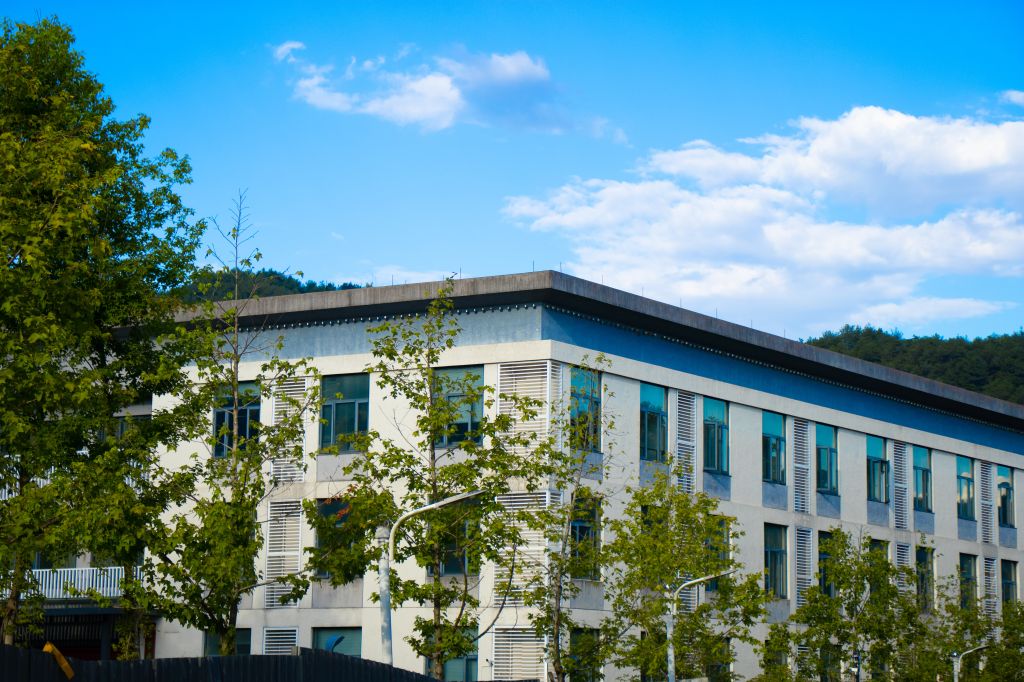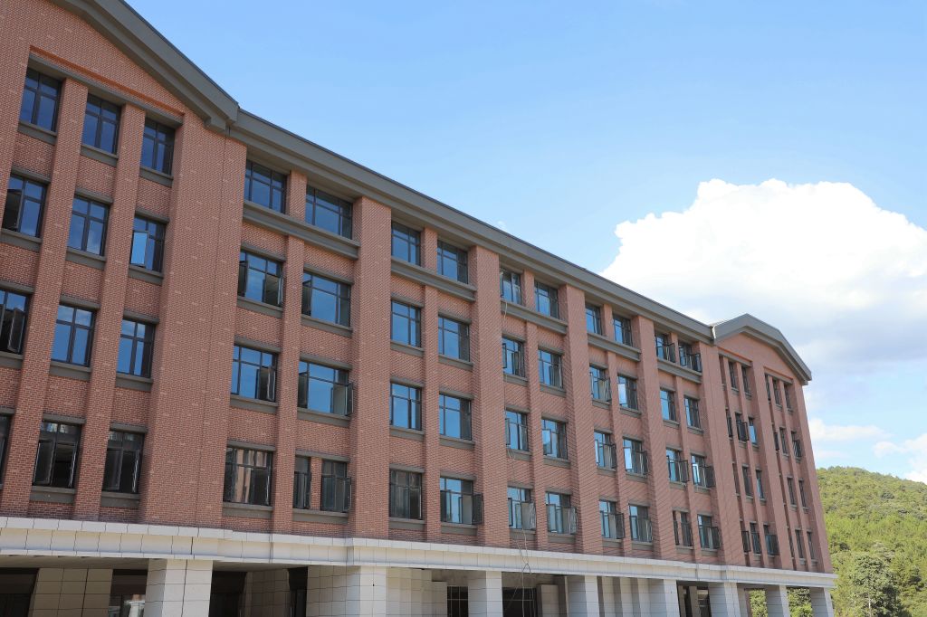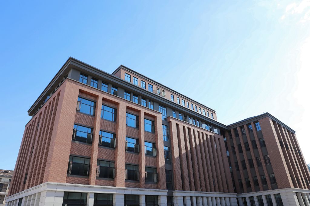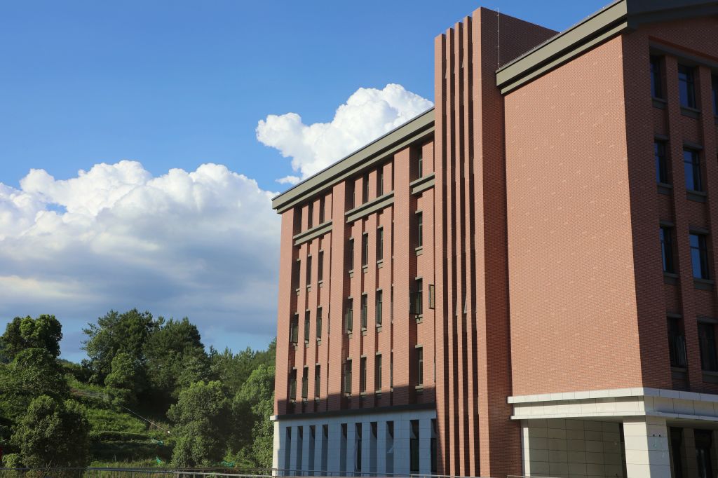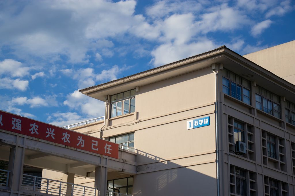 红墙褐顶的新农科大楼在蓝天白云的映衬下,