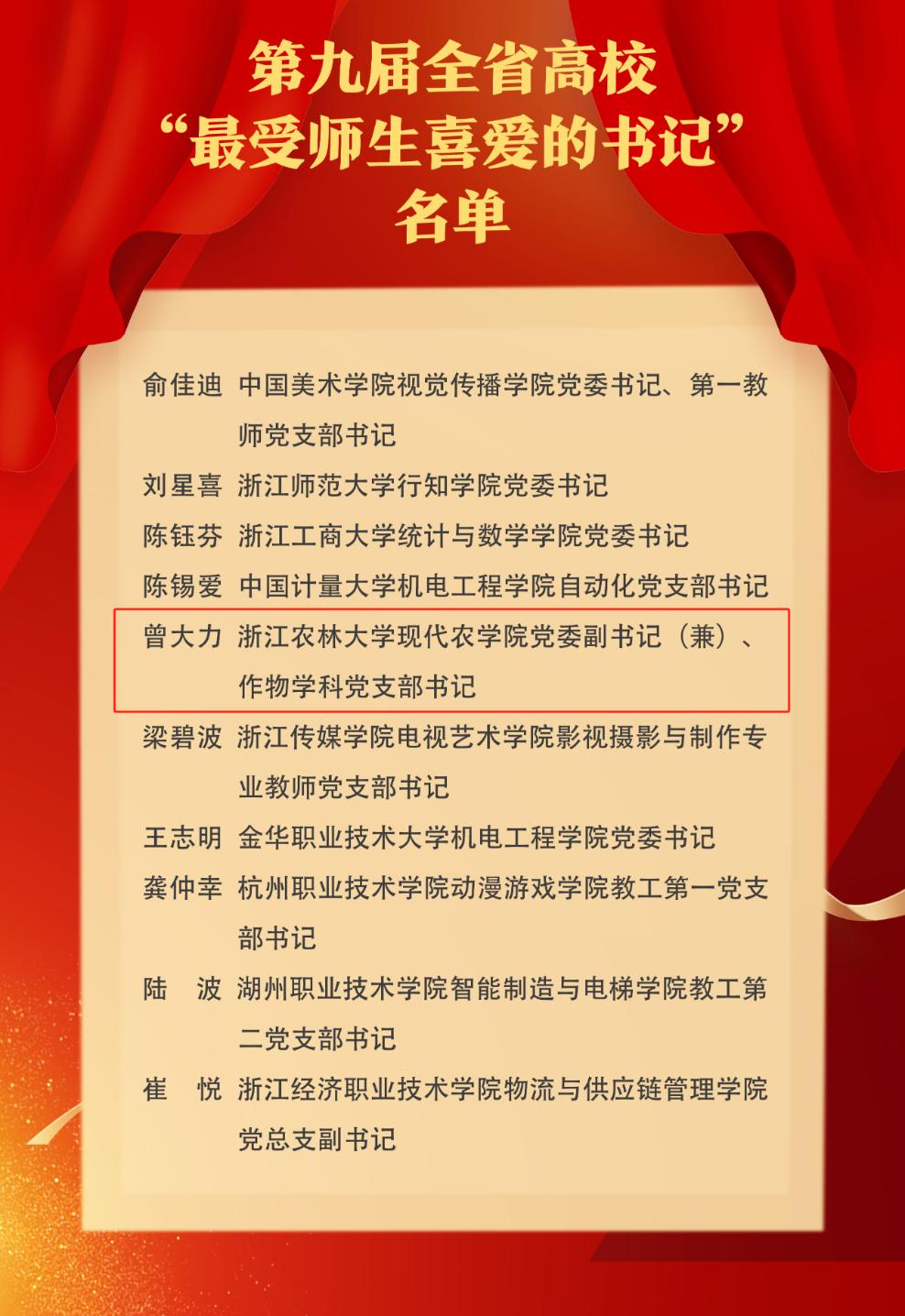 日前,浙江省普通高校党建研究专业委员会、浙江教育宣传中心公布了第九届全省高校“最受师生喜爱的书记”名单。beat365官网现代农学院院长、作物学科党支部书记曾大力同志荣获“最受师生喜爱的书记”称号。