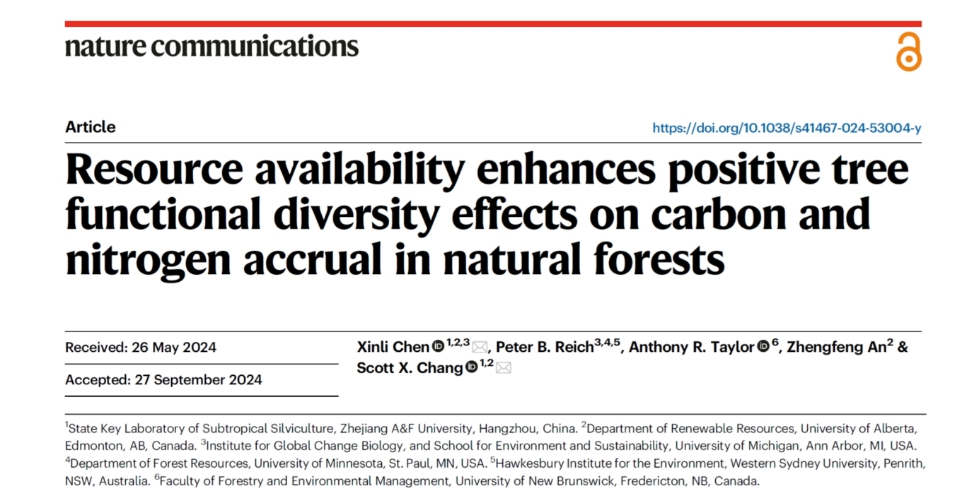 10月4日,国重实验室陈信力教授团队在《Nature》子刊《Nature Communications》(中科院1区Top,IF-5yr=16.1)在线发表题为《资源丰富度进一步增强了树木功能多样性对自然森林中碳氮积累的促进作用》(Resource availability enhances positive tree functional diversity effects on carbon and nitrogen accrual in natural forests)的研究论文,揭示了树木功能多样性对森林生态系统碳、氮累积的提升作用在资源丰富的环境下更强的科学结论。