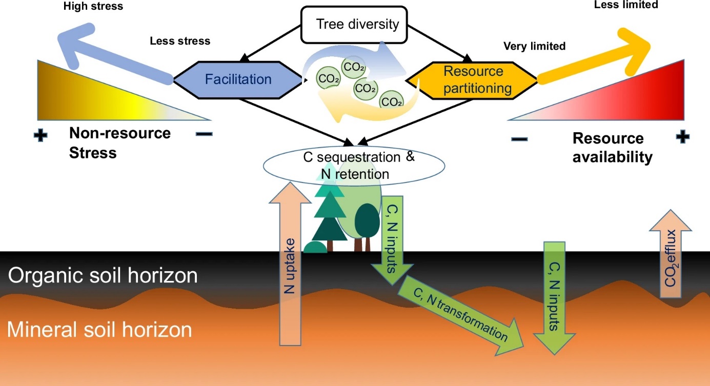 森林不仅是全球生物多样性的核心载体,也是强大的碳氮汇。在大量控制实验中,树种多样性的提升被证明可以通过增加树木生物量和土壤中的碳固存来缓解气候变化。然而,在自然森林中,不同环境梯度,特别是资源丰富度的变化,如何影响树种多样性对碳氮积累的作用,仍然缺乏深入理解。