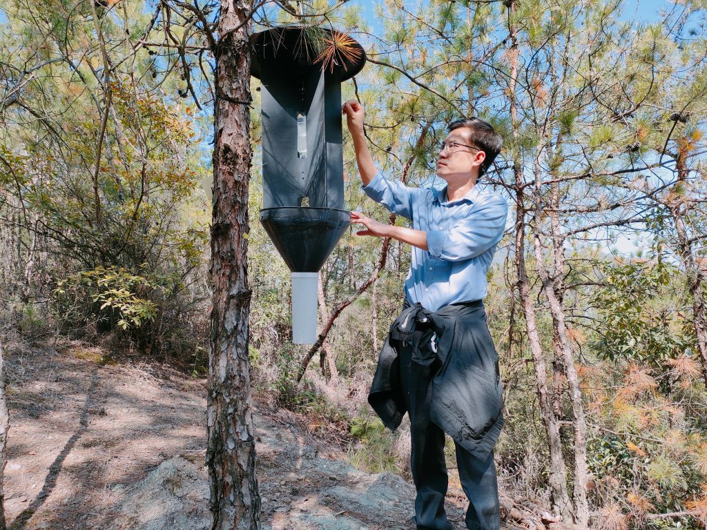 针对松材线虫病防控药剂匮乏,防治技术单一等问题,他们研究团队成功研发出松墨天牛新型诱捕技术和松材线虫病注干施药技术,实现了媒介昆虫的大量诱捕,以及松材线虫的精准环保施药,创新集成了以清理死树为核心,以诱捕压低虫口密度和注干预防侵染为辅助措施的松材线虫病绿色防控技术体系,有效遏制松材线虫病的传播蔓延。