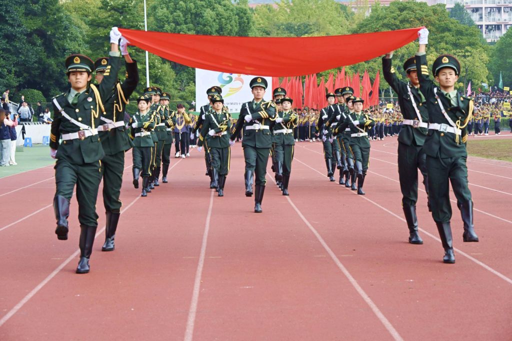 伴随着激昂的运动员进行曲,国旗方队、校旗会徽方队、彩旗方队、花束方队、各单位运动员方阵等依次入场。