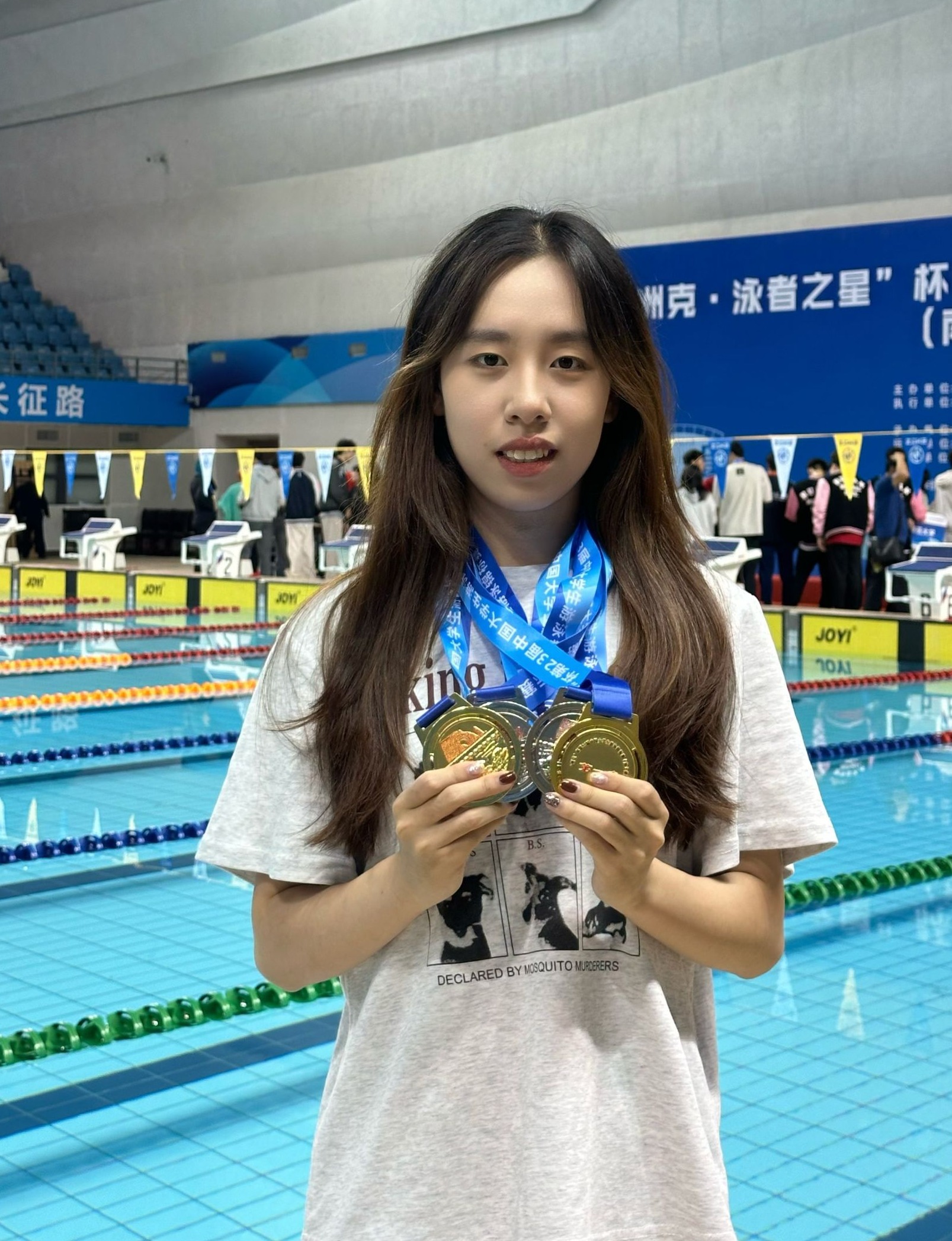 为者常成,行者常至。在2024年第23届中国大学生游泳锦标赛(南方赛区)中,林千淇拿到了4*100米混合泳接力、女子4*50米混合泳接力双金以及200m蝶泳银牌。同时她也在大胆尝试,跳出了自己蝶泳主项的舒适圈,挑战了200m混合泳并且拿到了银牌。正是那一个个在泳池里奋勇拼搏的日子,让她一步步站上了更大的领奖台,坚持和热爱也成就了她胸前一块块闪闪发光的奖牌。