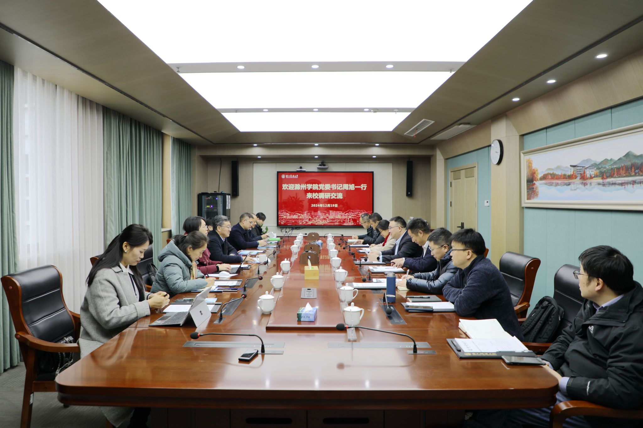 12月19日,滁州学院党委书记周旭、副校长陈桂林一行来校调研。校党委书记朱斌、副校长徐爱俊参加座谈交流。