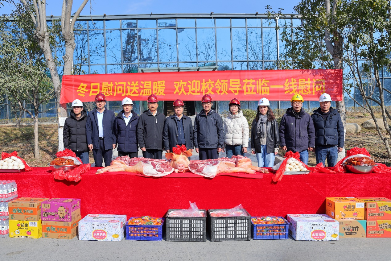 杨圆华及基础设施提质工程领导小组成员见证了D区学生宿舍建设工程的结顶,并代表学校对施工一线的建筑工人进行了慰问并表示感谢。