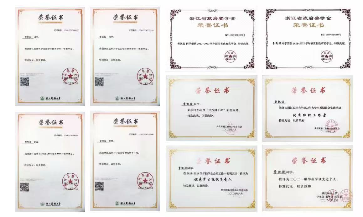 他成绩优异,多面发展,大学期间平均学分绩点4.01,专业排名第三;曾任第二十四届校学生会主席团成员、第十三届风景园林与建筑学院学生会执行主席等职务;多次获得省政府奖学金、校一等奖学金以及“优秀团干部”“优秀学生干部”“优秀学生组织负责人”等荣誉。