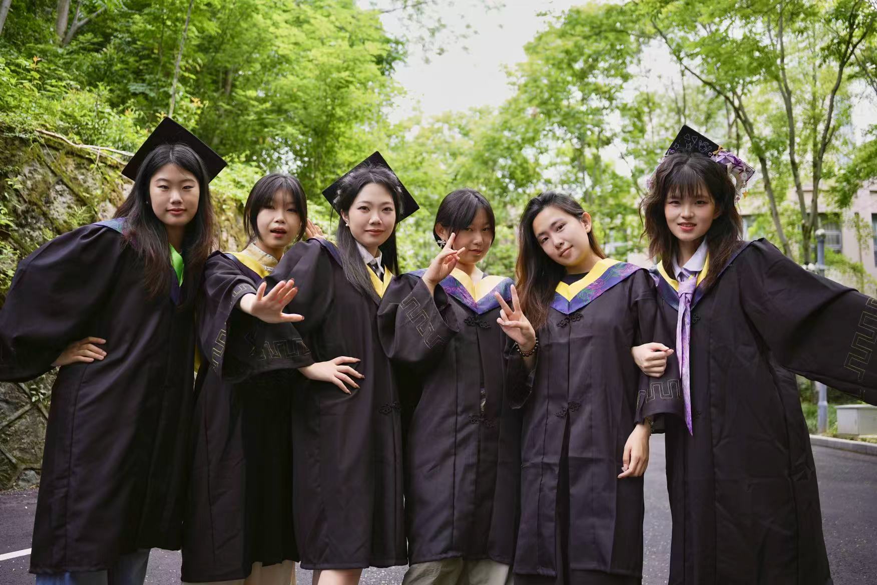 穿学士服的学子们在绿荫下合影