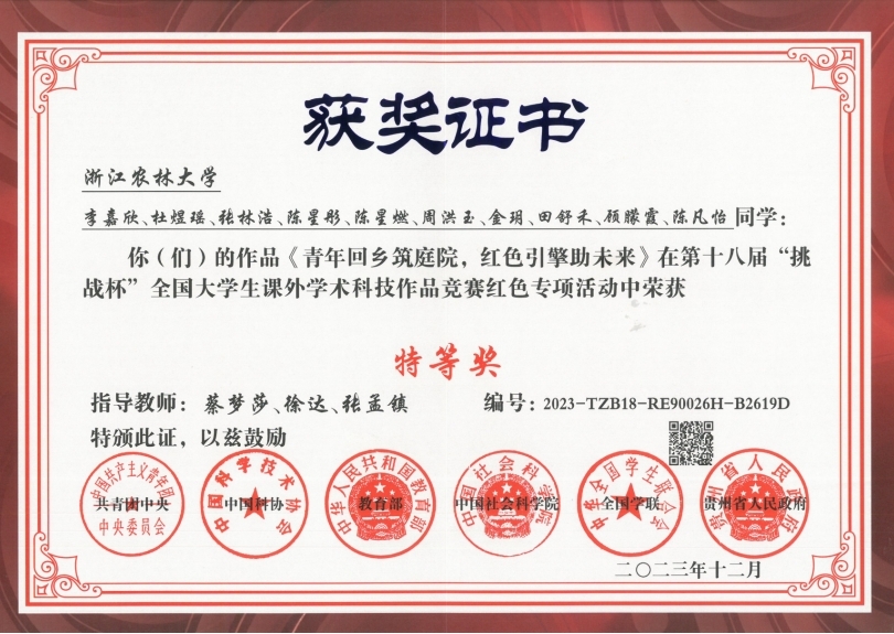 学院加强一二三课堂联动,推动社会实践与学科竞赛、科学研究等互融互促。指导学生获中国“互联网+”大学生创新创业大赛银奖,“挑战杯”全国大学生课外学术科技作品红色专项赛特等奖,浙江省大学生职业规划大赛一等奖,浙江省大学生乡村振兴创意大赛金奖等国家级、省级一类学科竞赛300余项荣誉。涌现出全国道德模范章宬、全国农村青年致富带头人杨珍、全国就业创业先进典型人物李雪、浙江省青年工匠徐硕含等一批优秀校友典型。