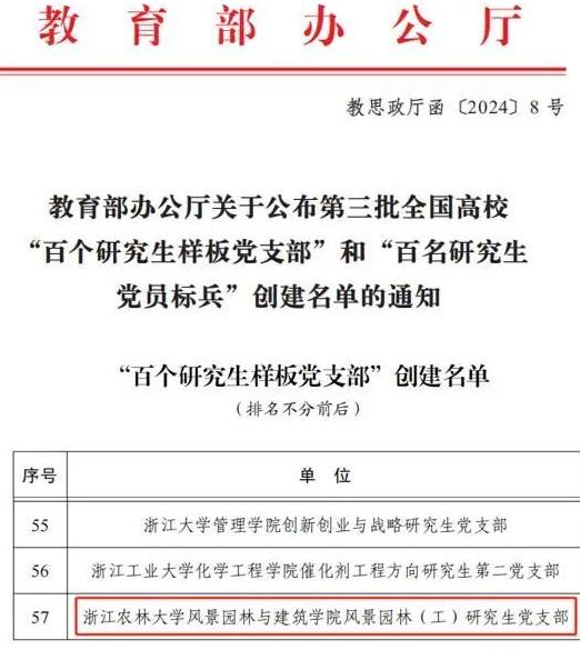 学院坚持把支部建在学科上,助推党建与业务深度融合。学院党委和风景园林学科入选“浙江省高校党建工作标杆院系”、“浙江省高校党建工作样板党支部”培育创建单位。风景园林(工)研究生党支部入选全国高校“百个研究生样板党支部”培育创建单位。学院人居环境省级实验教学中心获“浙江省巾帼文明岗”荣誉称号。