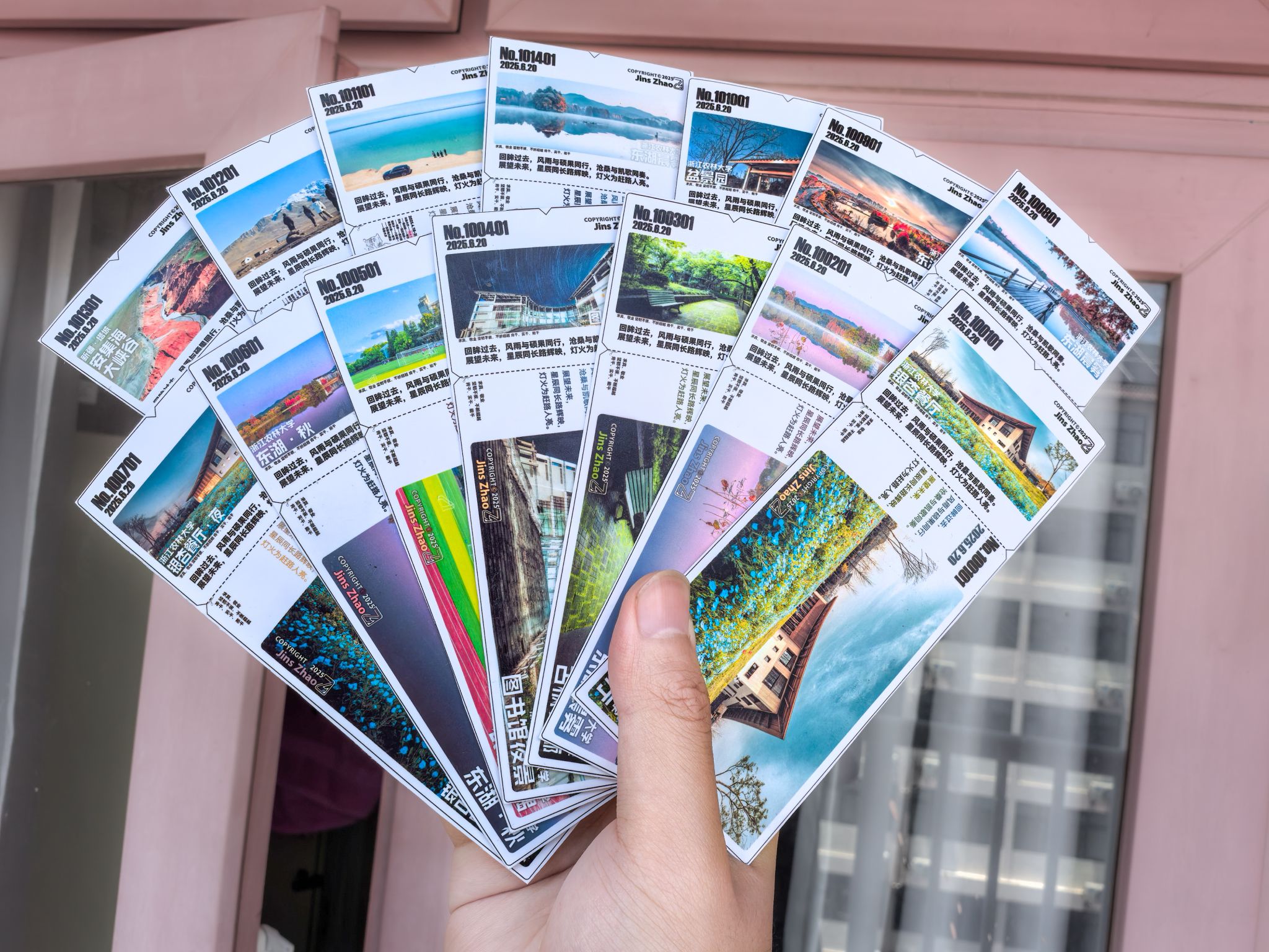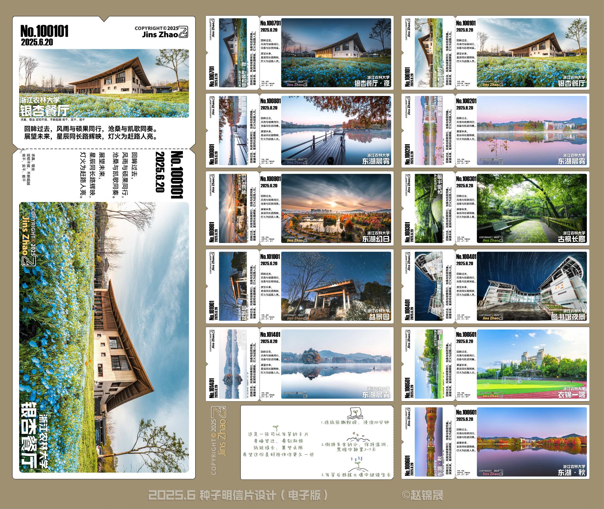 于是,他将摄影作品设计成明信片的样子,并参考演唱会门票主副券的形式制作。一半种下,可以看见生命萌发的欢欣雀跃;另一半留念,是属于浙农林大的独家记忆,“两个愿望,一次满足”。他还赋予了每张明信片唯一的编号,这份送给大家的毕业礼物,也因此愈显珍贵。