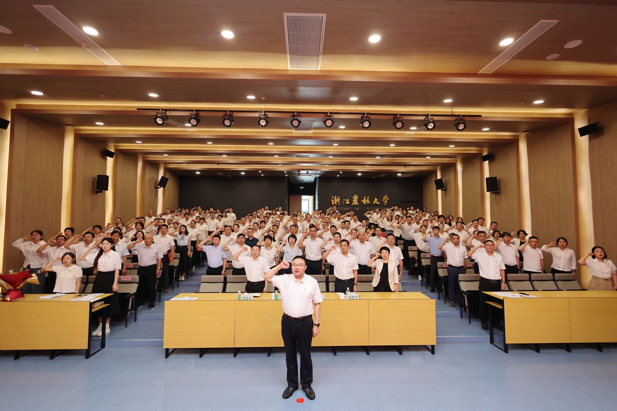 大会举行了集体宣誓仪式。校党委书记朱斌领誓,全体参会党员重温入党誓词。