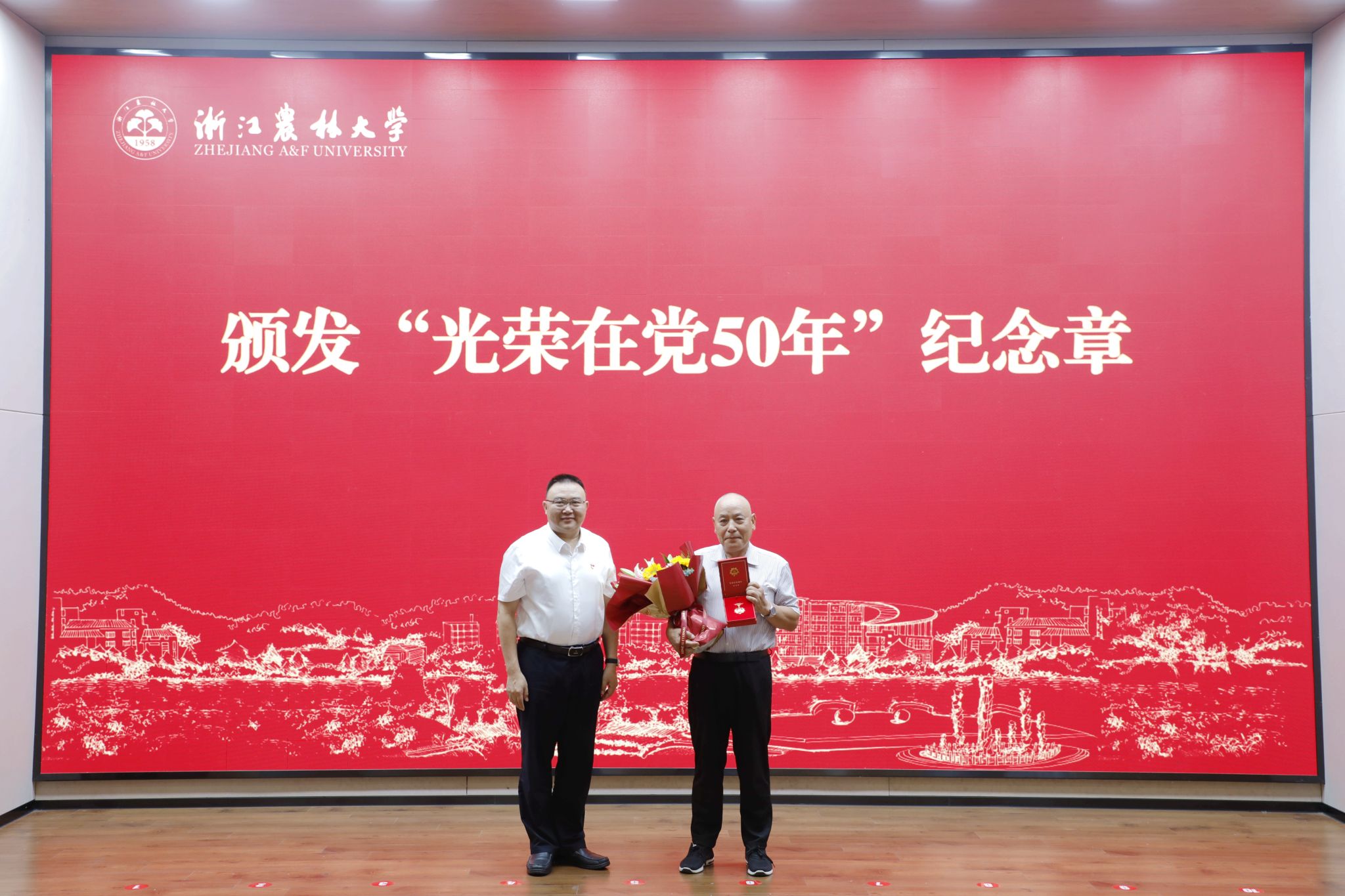 大会隆重举行了“光荣在党50年”纪念章颁发仪式,校党委书记朱斌为老党员颁发纪念章。