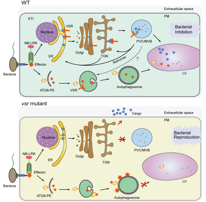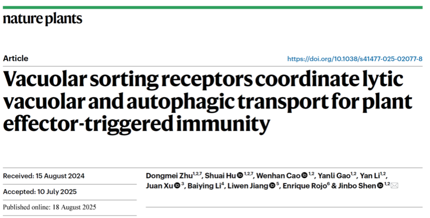 8月18日,全国重点实验室沈锦波教授团队在《Nature Plants》(中科院1区Top,IF-5yr=17.0)在线发表题为“Vacuolar Sorting Receptors Coordinate Lytic Vacuolar and Autophagic Transport for Plant Effector-Triggered Immunity”(《植物液泡分选受体协同调控液泡与自噬途径参与效应因子触发免疫》)的研究论文。该研究揭示了植物液泡分选受体VSRs通过调控液泡水解酶精准投递与效应因子自噬清除的“双线作战”,有效抵抗病原细菌的侵染,为农林作物抗病育种提供了新的分子靶点。