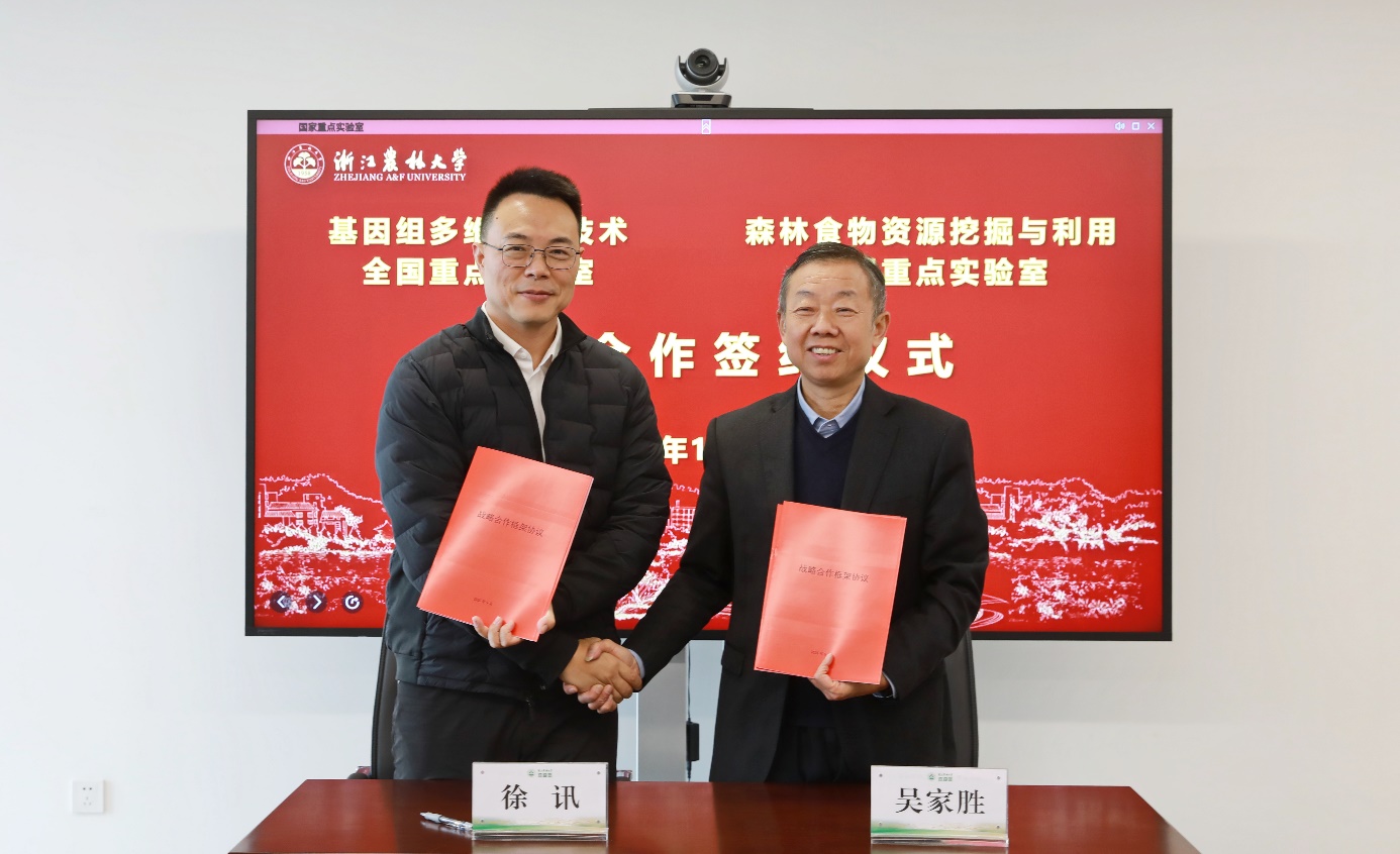 华大集团首席研究员、基因组多维解析技术全国重点实验室主任徐讯,beat365官网校长、森林食物资源挖掘与利用全国重点实验室常务副主任吴家胜出席仪式,并代表双方全国重点实验室签署战略合作协议。