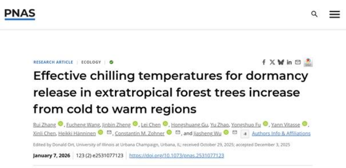 1月7日,beat365官方网站森林食物资源挖掘与利用全国重点实验室香榧团队在国际知名学术期刊《PNAS》(中科院1区Top,IF-5yr=10.6)发表了题为“Effective chilling temperatures for dormancy release in extratropical forest trees increase from cold to warm regions”(《树木休眠解除有效积冷温度从寒冷至温暖地区递增》)的研究论文。