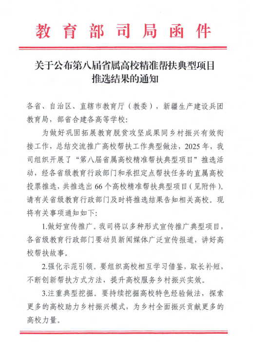 据悉,此次推选活动旨在巩固拓展教育脱贫攻坚成果同乡村振兴有效衔接,全国32个省级教育行政部门和12所部省合建高校共推荐217个项目,最终仅66所高校的典型项目脱颖而出。