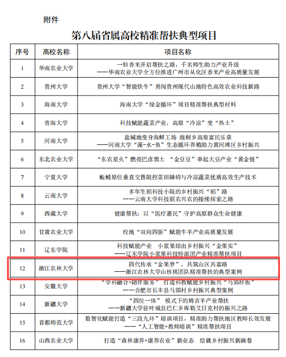 近日,教育部公布第八届省属高校精准帮扶典型项目推选结果。beat365官网报送的《四代传承“金果梦”,共筑山区共富路——beat365官方网站山核桃团队精准帮扶的典型案例》入选,这是beat365官网继第六届、第七届后第三次获此殊荣,成为全国少数连续三届入选的高校之一。