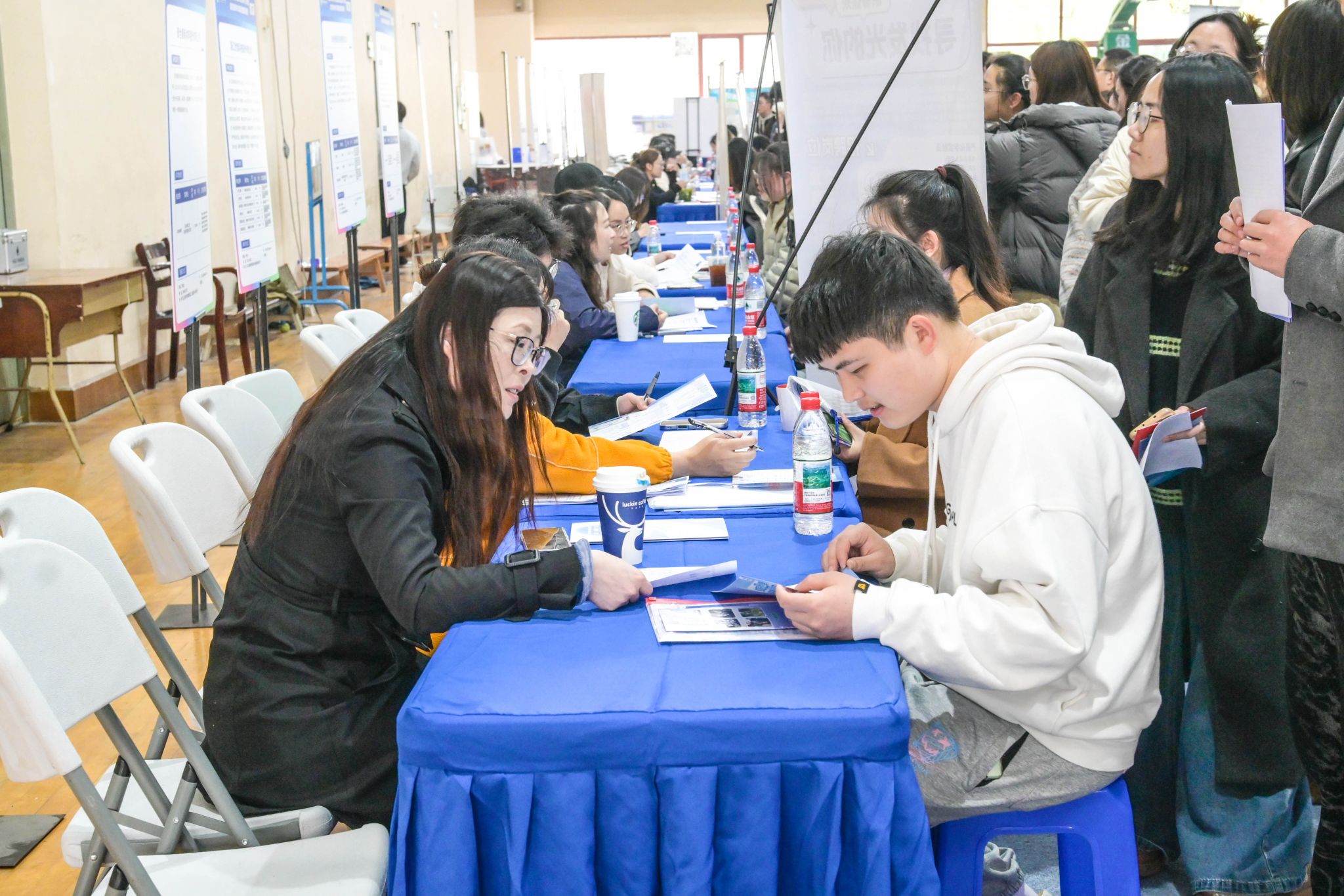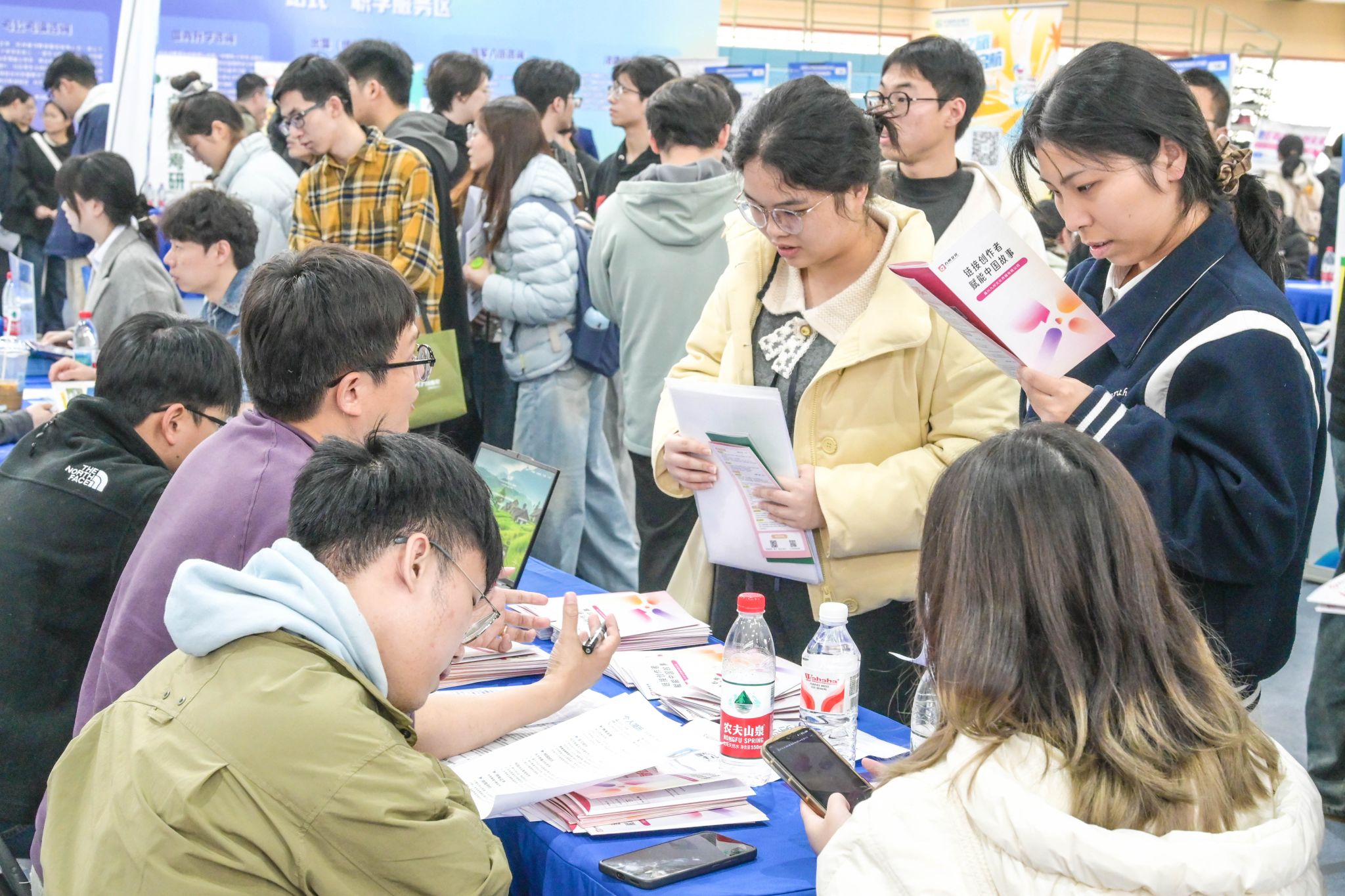 校就业中心提前谋划、精心组织,通过多种渠道向毕业生发布招聘会信息,引导毕业生根据自身专业和职业规划精准求职,确保了招聘会有序进行。招聘会现场还设立了服务专区:“一站式”职学咨询专区提供考公考编、升学等政策解读与规划建议;师友导师面对面专区提供一对一简历修改、求职技巧指导;AI智慧就业体验专区借助人工智能,提供简历优化、岗位匹配、模拟面试等服务,成为现场亮点。