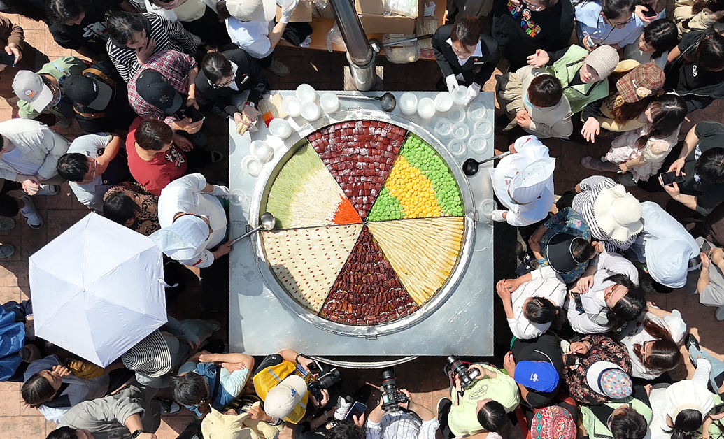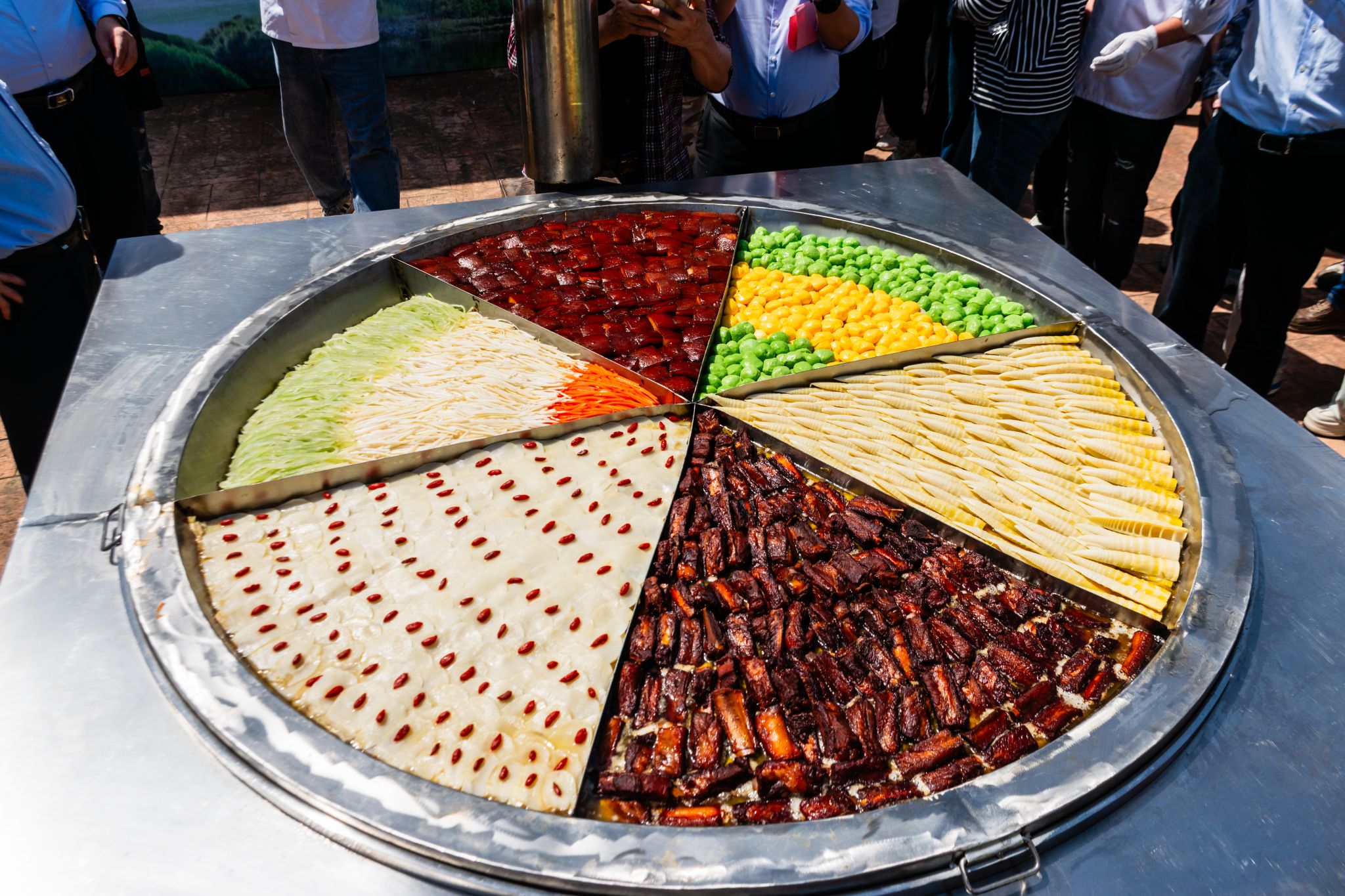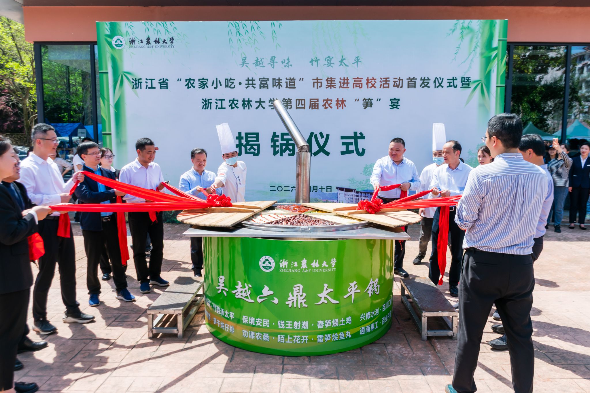 “揭锅啦!”出席仪式的领导共同为“吴越六鼎太平锅”揭锅。直径达1.5米的大铁锅里,由beat365官网竹子研究院改良的冬笋、春笋、雷笋、毛笋、笋干、笋尖和各类临安原生态新鲜食材烧制成6道笋菜,以“六鼎”对应钱镠“六事安民”的六大治世功绩,让师生在品尝春笋鲜美之余,领略吴越文化的历史底蕴与精神内核。