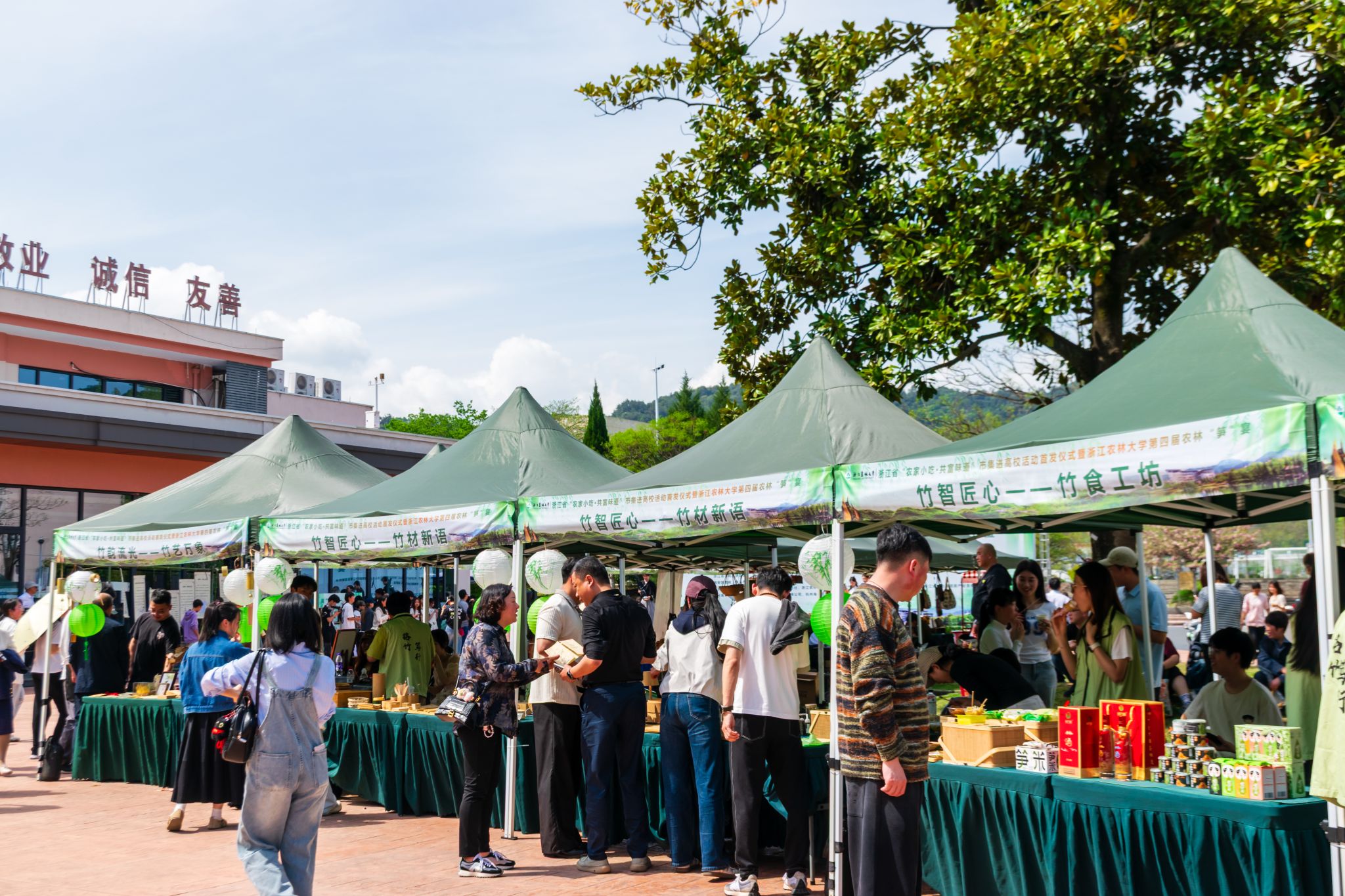在“竹韵匠心”板块,热闹的“吴越竹市”人声鼎沸。各类竹盆景、竹苗、竹食品、竹制品及竹文创琳琅满目。吴越非遗展区汇聚了竹编、天目漆器等非遗传承人,现场展演与DIY体验吸引了众多师生参与。活动以“展销+体验”的模式,打通了竹产品从林区走向校园、走向市场的通道,切实将生态优势转化为经济优势,为临安当地竹农拓宽了增收致富的路子。