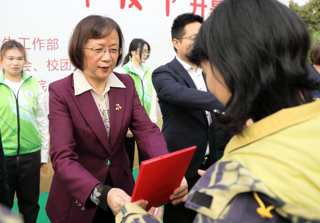 沈月琴为平山基地、百草园、农作园、茗茶园大学生劳动实践队伍授旗,鼓励大家长期扎根实践基地,为教育部高校思想政治工作精品项目“七彩新农人”耕读教育实践基地建设贡献青春力量。