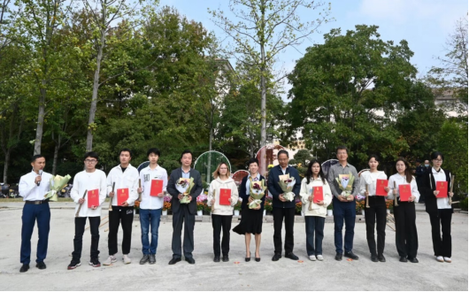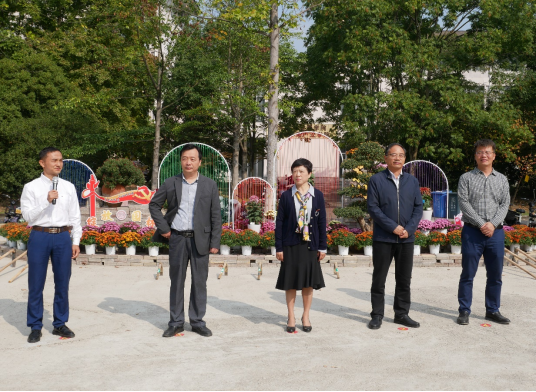 施美红宣布东湖菊影菊花展开幕。施美红、胡祖吉、倪建均等为第二届菊文化主题花园设计大赛获奖代表颁发了证书及项目落地劳动工具。