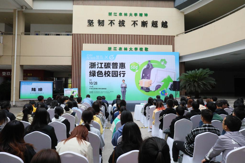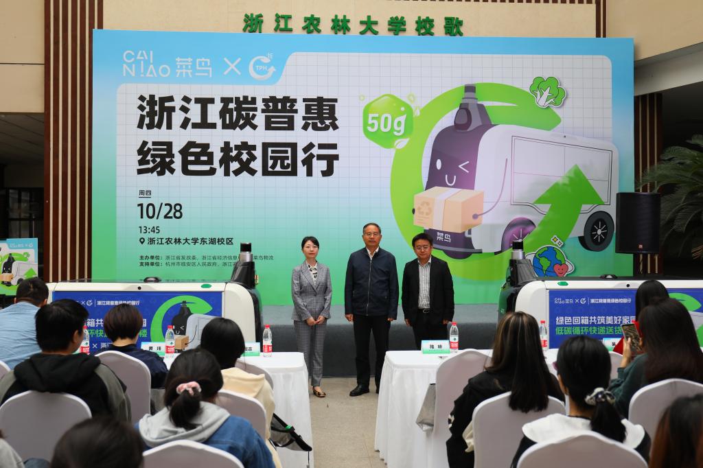 10月28日,由浙江省发改委、浙江省经济信息中心、菜鸟物流联合主办的“浙江碳普惠绿色校园行”活动在beat365官网东湖校区活动中心举行。副校长胡祖吉,省发改委环资处处长陆琼、省经济信息中心能环部主任黄炜、浙能碳资产公司副总经理吴楠、菜鸟ESG副总裁牛智敬菜鸟绿色物流总经理王昊苏、等出席活动。