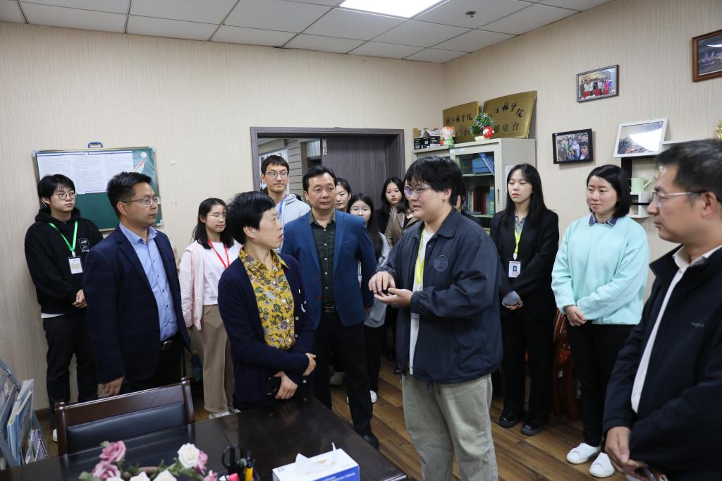 施美红先后走访了学生通讯社办公室、网络电视台、广播电台等,与学生记者进行了亲切交流。她深入了解了相关校园媒体的人员配置、工作内容和工作流程等情况,对学生通讯社成立以来获得的诸多工作成果以及国家级、省级荣誉给予了充分肯定,对学生记者的辛勤付出表示感谢。施美红表示,今天是属于记者的节日,很高兴与校园里的学生记者们进行交流,希望同学们能更加深入地了解宣传党的方针政策,不断提高政治素养和新闻素养,用笔尖、镜头和声音丰富浙农林大师生的校园生活,在学校高质量发展的过程中继续作出新的更大的贡献。