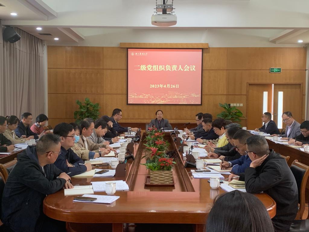4月26日,学校召开二级党组织负责人会议,专题部署学校主题教育相关工作。校党委副书记冯尚申,校党委委员,组织部部长、统战部部长缪鲁加出席会议。