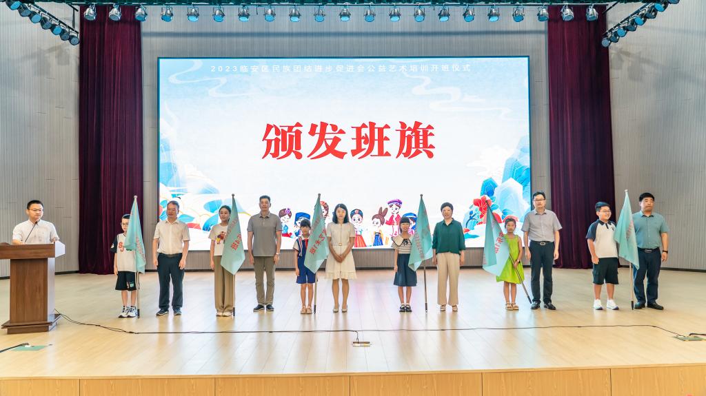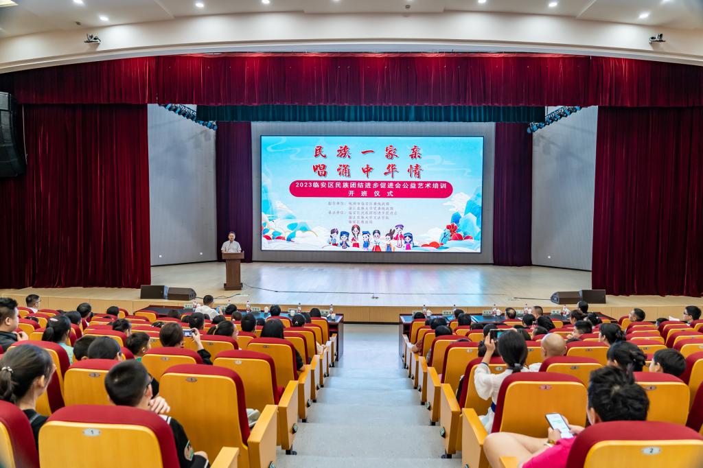 7月10日上午,“民族一家亲 唱诵中华情”2023临安区民族团结进步促进会公益艺术培训活动开班仪式在beat365官方网站衣锦校区举行。校党委副书记施美红,临安区委常委、统战部部长陈娜,校党委委员、组织部部长、统战部部长缪鲁加,文法学院负责人出席活动。