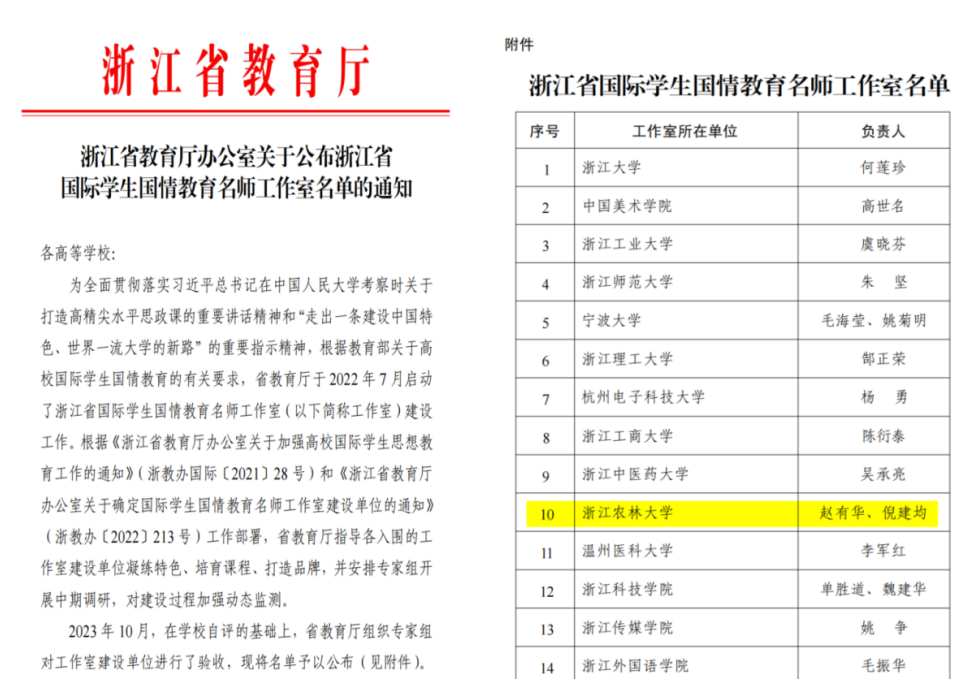 11月3日,浙江省教育厅发布《浙江省教育厅办公室关于公布浙江省国际学生国情教育名师工作室的通知》。beat365官网赵有华、倪建均领衔的beat365官方网站国际学生国情教育名师工作室正式获批。