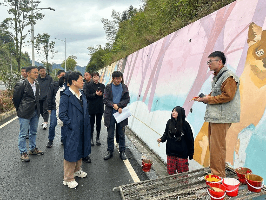 施美红实地考察了G205国道两侧由园林学院师生团队创作设计的墙绘作品落地情况,听取了创作团队的设计历程和设计理念,对参与墙绘创作和绘制的师生表达了慰问,并对设计作品表示了充分肯定。施美红表示,园林学院在开化开展的“开源化境”杯全国大学生乡村振兴创意规划大赛成果的顺利落地,促进了专业教育的开展,也丰富了学生的专业实践经验,这不仅是园林青年薪火传承的具体表现,也是以行动助推乡村建设的模范之作。她希望园林学院能够充分发挥学院专业和人才优势,将校地合作的优良传统延续下去,并在这一过程中不断跟进,使之更加符合地方的服务需求,为助力开化高质量发展做出更多贡献。