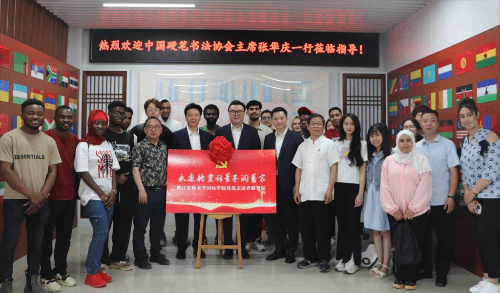 活动现场还举行了“永远听党话 笔墨润万家”beat365官方网站国教学院党建志愿者服务站揭牌仪式。中国硬笔书法协会将携手临安分会,与国教学院合作加强党建共建,为进一步提高来华留学生讲好中国故事的能力作出共同努力。