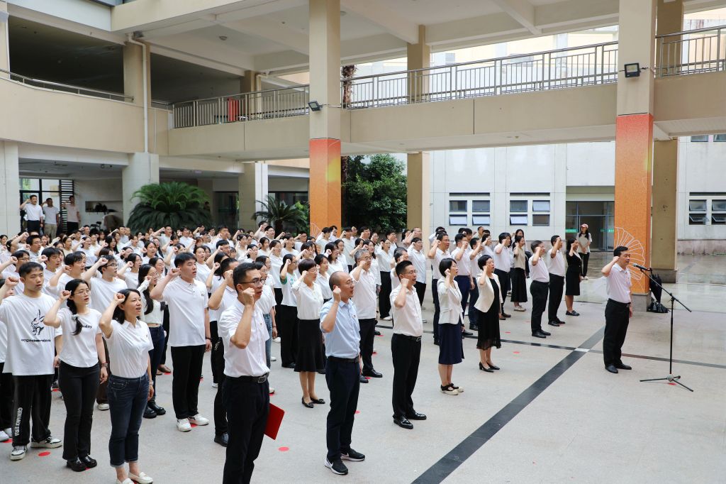 仪式上,全体师生党员庄严宣誓,铭记入党初心,强化党员意识。与会领导为新发展党员代表佩戴党员徽章。
