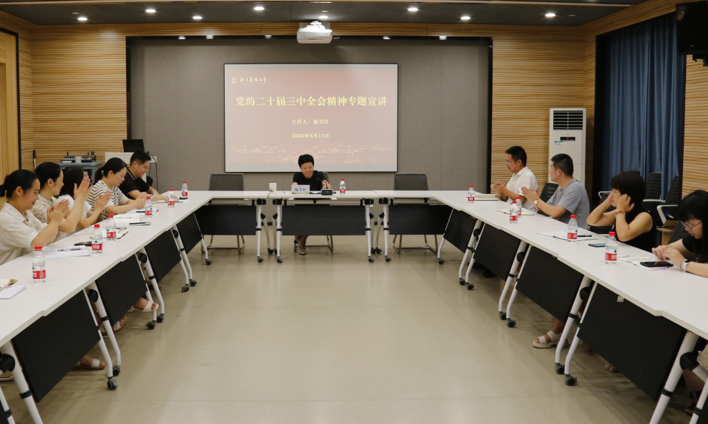 近日,校党委副书记施美红到机关第五党支部宣讲党的二十届三中全会精神。学工部、学生处全体成员参加会议。