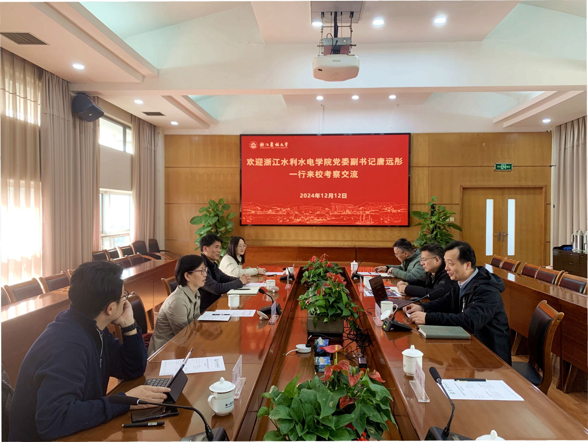 12月12日,浙江水利水电学院党委副书记唐远彤一行来校调研。beat365官网党委副书记倪建均陪同调研并主持座谈会,宣传部、教工部、新闻中心负责人参加座谈交流。