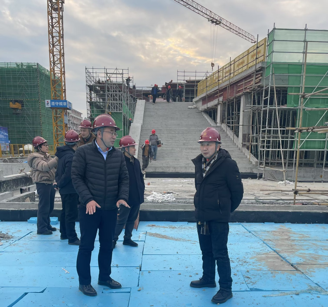 包松永一行详细听取了基建处关于项目概况及施工进度的工作汇报,实地查看并深入了解工程实施现状及周边区域配套工程的推进计划,并到学习中心三层顶板施工现场,察看钢筋绑扎、工人操作状况,了解塔吊等大型施工设备的规范操作流程以及施工现场的安全管理措施等情况,对项目进展给予了充分肯定。