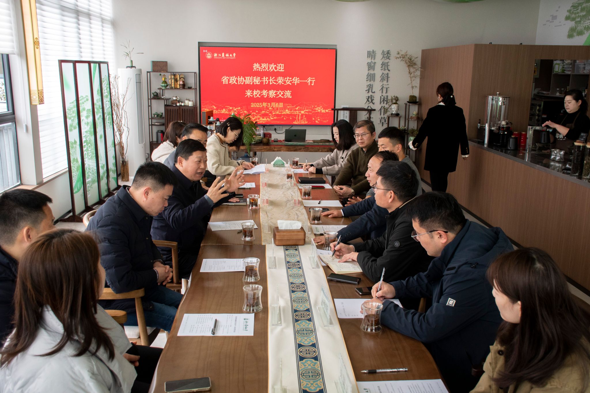 茶学院有关负责人介绍了学院和茶文化建设等情况,双方参会人员就茶空间设计、新式茶饮等工作进行了深入交流。