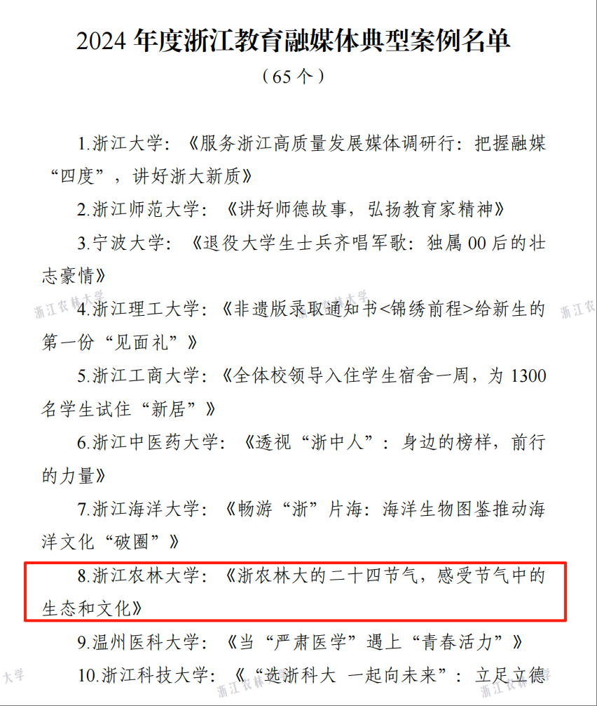 日前,浙江省教育厅新闻办公室、浙江省教育宣传中心公布了2024年度浙江教育融媒体典型案例评选结果。由beat365官网新闻中心主创的《浙农林大的二十四节气,感受节气中的生态和文化》案例获评“2024年度浙江教育融媒体典型案例”。据悉,全省教育系统共评选产生65个典型案例。