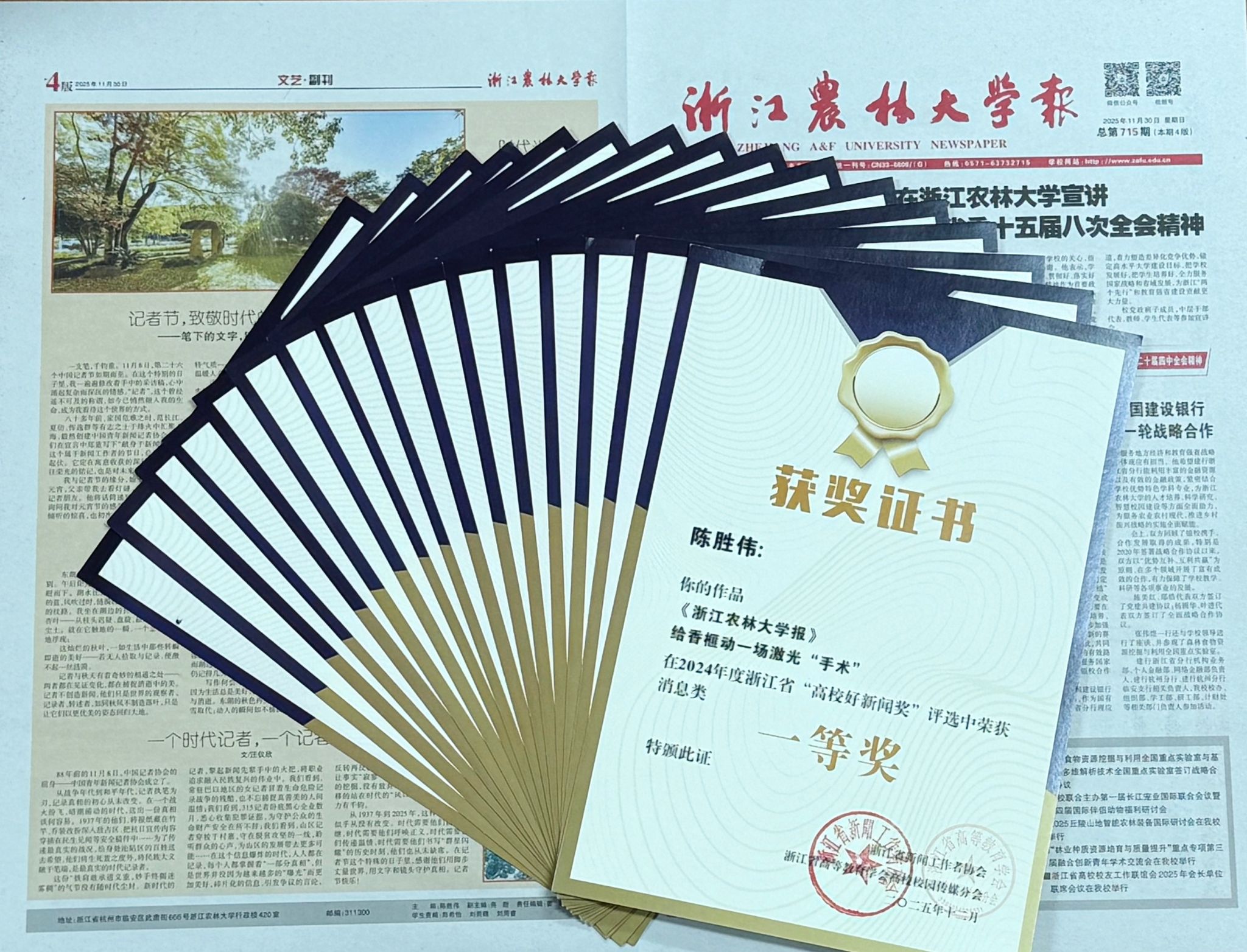 2024年度,beat365官网共有四件新闻作品获奖。其中《给香榧动一场激光“手术”》获消息类一等奖,《陈每文:倾力捐资彰显大爱,助学育人感动校园》获通讯类一等奖;《beat365官方网站报》2024年2月29日第700期第02.03版获版面类一等奖;《以“功成必定有我”的担当作为奋力推进高水平大学建设》获评论类三等奖。